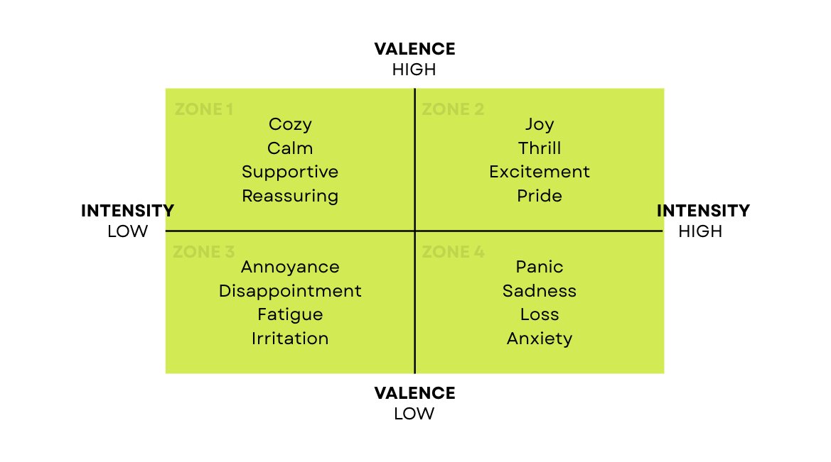 Zone 1 (Positive + Low Intensity): The 'Soft' Zone. Calm and reassuring.